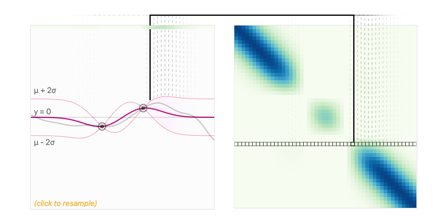 核函数,一般用作一种距离的度量,可以理解为可以两个样本点的相互影响。 这里用现有样本的特征 建立随机变量间的距离,再用其作为每个维度之间的协方差。 此处的核函数有多种选择方式,可以起到添加先验知识的作用。 此外,核函数还可以通过组合来使用,比如加法组合、乘法组合等,通常会获得一些合并的特性,比如既是周期又有线性。